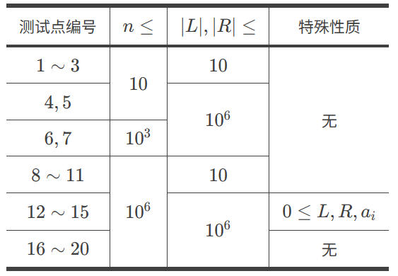 1 ≤ n ≤ 106, -106 ≤ L,R,ai ≤ 106,L ≤ R 。